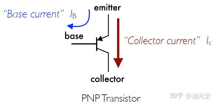 在PNP中,发射极和基极形成一个二极管,电流只能流向一个方向,但这次只能从发射极流向基极(同样,在箭头的方向)。而且,当电流流经该二极管时,它允许电流IC=h×IB从发射器流向集电极。