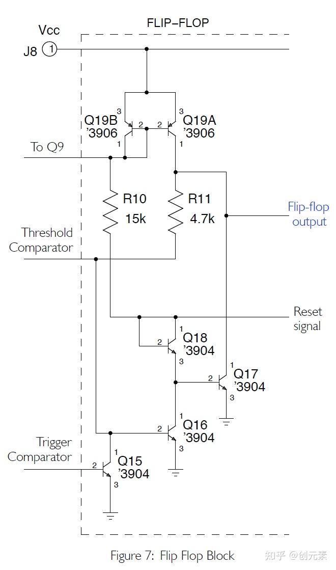 一个电流镜像是由Q5、Q6、R1和R2组成。另一个是由Q7、Q8、R2和R3组成。晶体管Q6和Q7承担双重任务--它们是电流镜像电路的一部分,但与R2一起工作,也充当差分放大器。Q6的集电极是放大器的输出端,并被输送到flip-flop块。Q7的集电极接地,不被使用,但它可以被认为是 "反相 "输出。