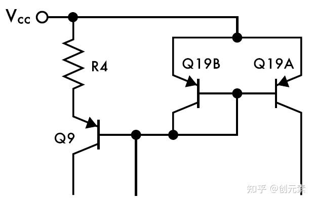 电流镜可以用多个 "输出 "晶体管构成,Q9是一个额外的输出晶体管,它与Q19A并联,跟踪通过Q19B的电流变化。
