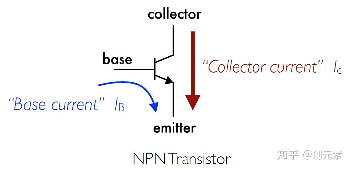 一个NPN双极晶体管的三个终端被命名为 "基极"、"集电极 "和 "发射极"。基极和发射极引脚组成一个二极管,由其原理图符号上的小箭头表示。二极管是一个单向的电路元件,所以在正常情况下,电流只能从基极流向发射极,而不能从发射极流向基极。