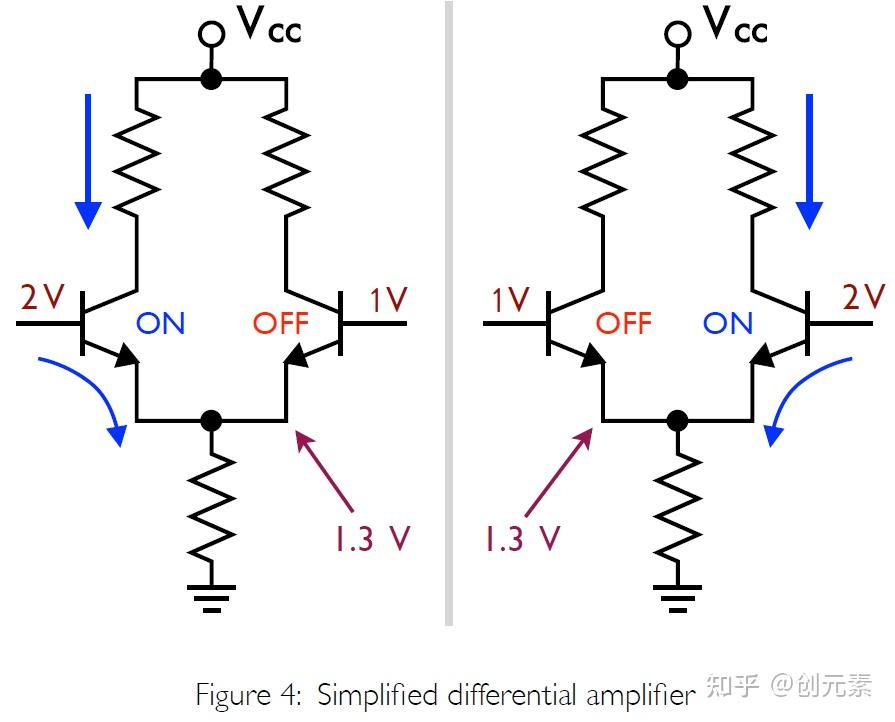在左边的情况下,放大器的输入是2V(左输入)和1V(右输入)。 由于左边的输入电压较高,左边的晶体管会更强烈地打开,通过集电极的电流更大。 发射极的电压饱和到1.4V(2V,减去一个二极管压降),关闭另一个晶体管(因为发射极电压高于基极电压)。