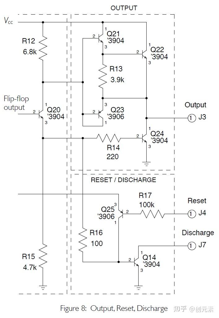 flip-flop输出驱动电流进入Q20的基极,使其开启。来自Q20的电流使Q24和Q14导通。R16和R14分担来自Q20的电流,这样这两个晶体管就可以从一个输出端被驱动。Q14将放电引脚拉低,而Q24将输出引脚拉低。