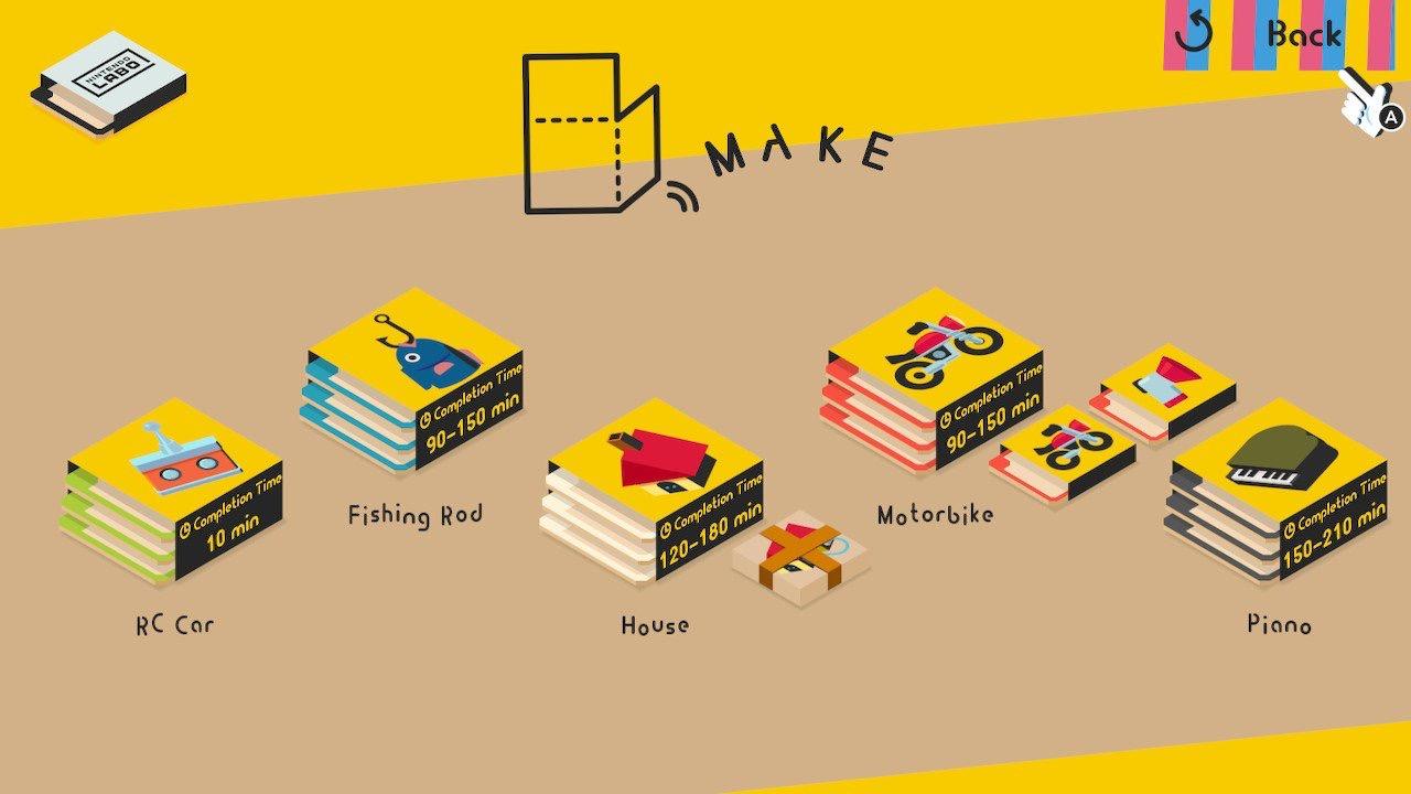 下图是「拼装」的开启页面,一共五个小游戏,每个小游戏的拼装过程都是 90 - 150 分钟不等,这也是 Labo 这款游戏的一部分。