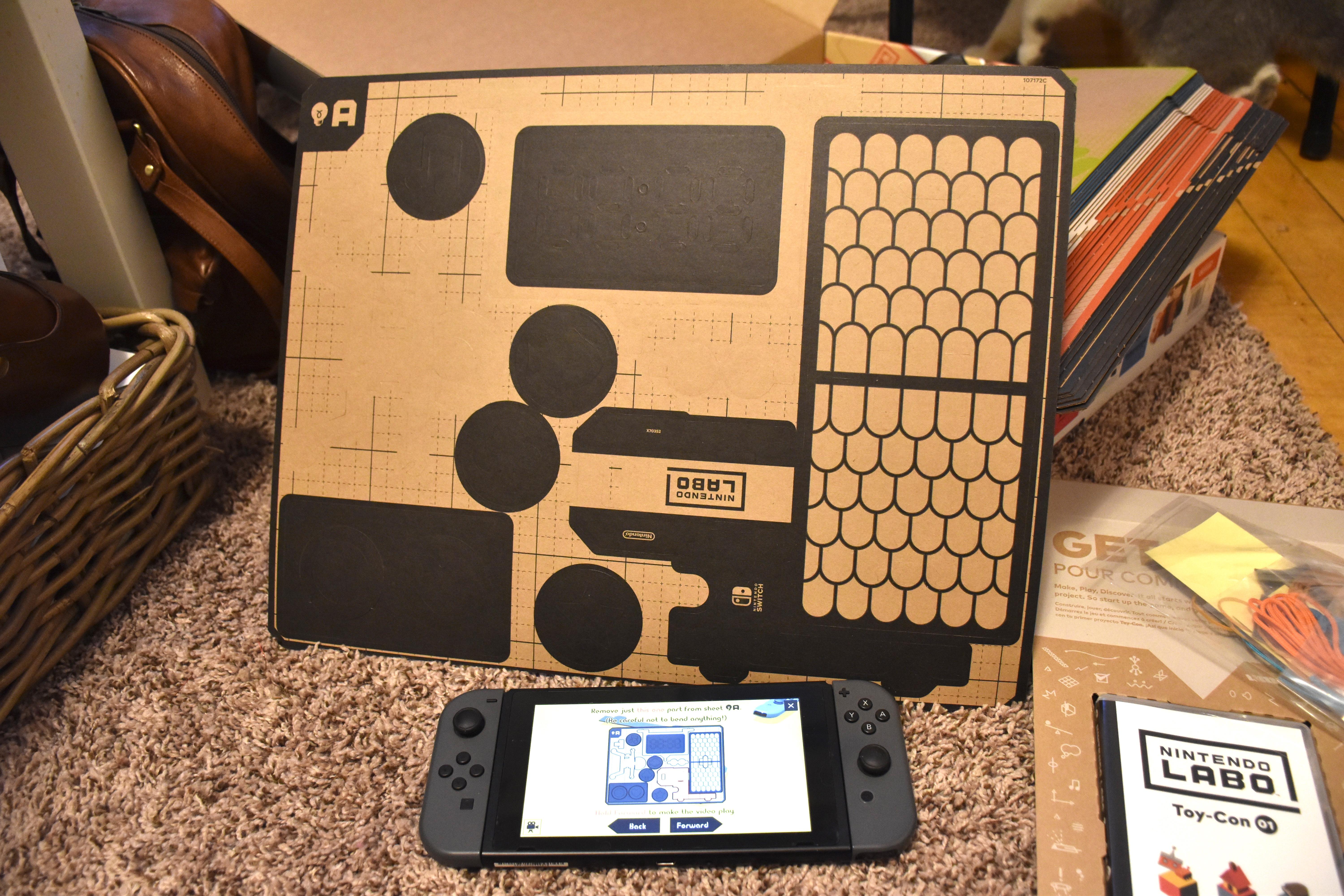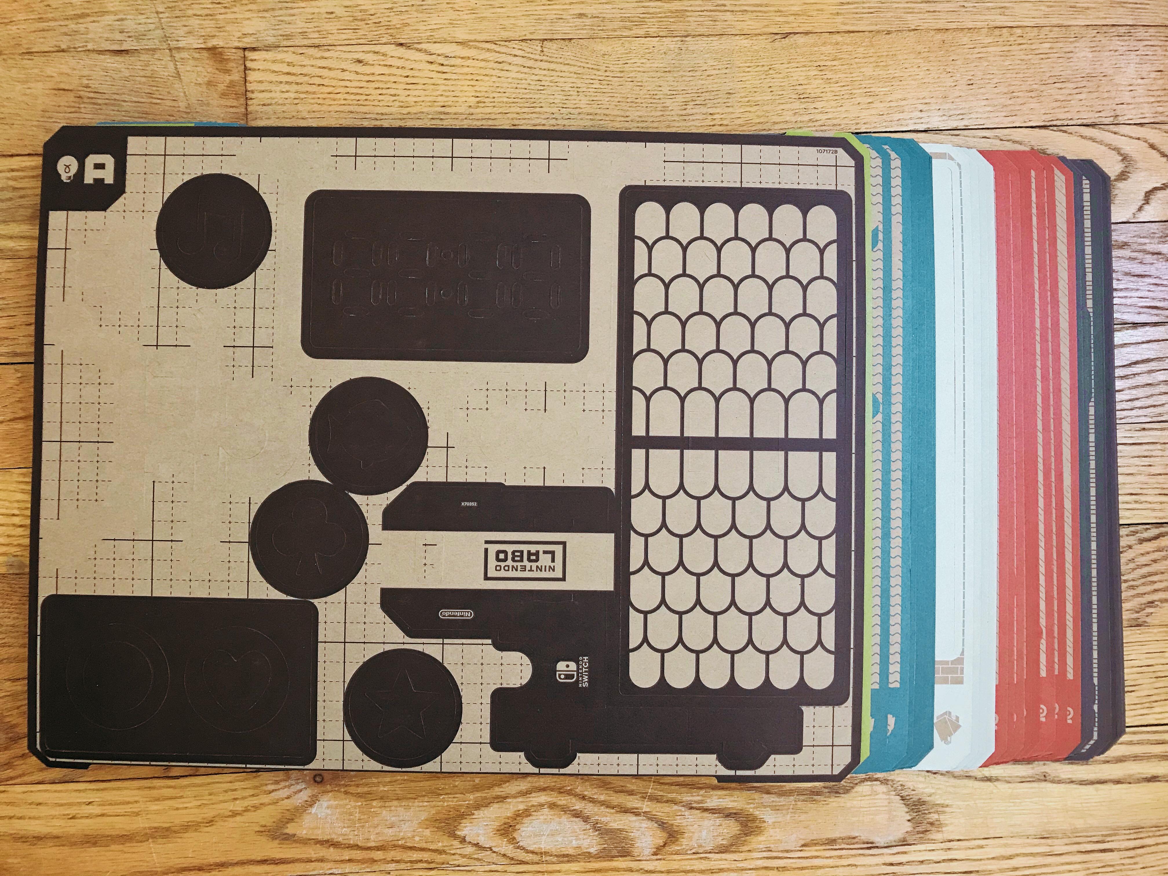拼装让我体验到小学时候上美术课的场景,带上纸板、画笔、剪刀、胶布,然后照着课本制作出各种小玩意儿。这一次任天堂把这些东西都准备好了给我们,实际操作中不需要任何额外的工具,纸板制作非常精良,按照凹槽就能把零部件取出来,对照着 Switch 上的教程,完成自己游戏工具的组装,最后完工后才能玩上游戏。