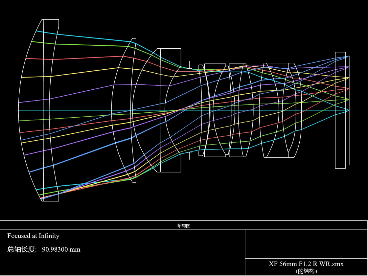 对焦是除去前二后三的整个中间部分。对比 RF85L ,简直就是双胞胎,都是一个Sonnar血统浓厚的复杂结构。不过仔细看来也有很多不同:佳能拆分了前组,于是光束降高更猛烈,佳能也把非球面布置在了前组高硬度异常色散材料上;富士则在后组靠近光圈位置以及末尾分别布置了单独的非球面,均为常规压铸材料。
