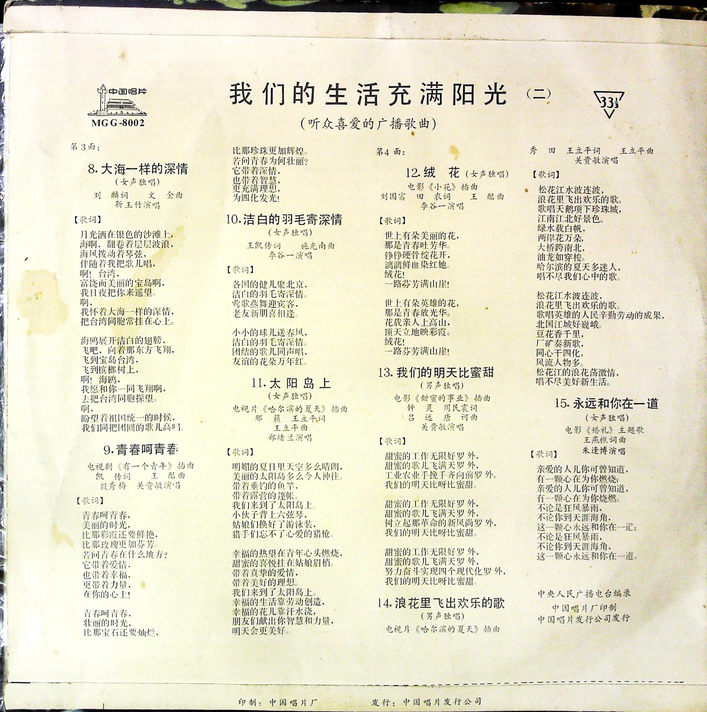 实际上,在众所周知的政治运动之后,中国流行音乐的复苏就开始了,其中最具代表性的是在1980年的一次全国投票,《歌曲》杂志和中央人民广播电台举行过一次投票,让观众们评选最爱的广播歌曲。最后获奖的歌曲以一个双张的黑胶唱片发行,就是下面这张了。两张的封面正面是一样的,背面有不同,在这里展示给大家。