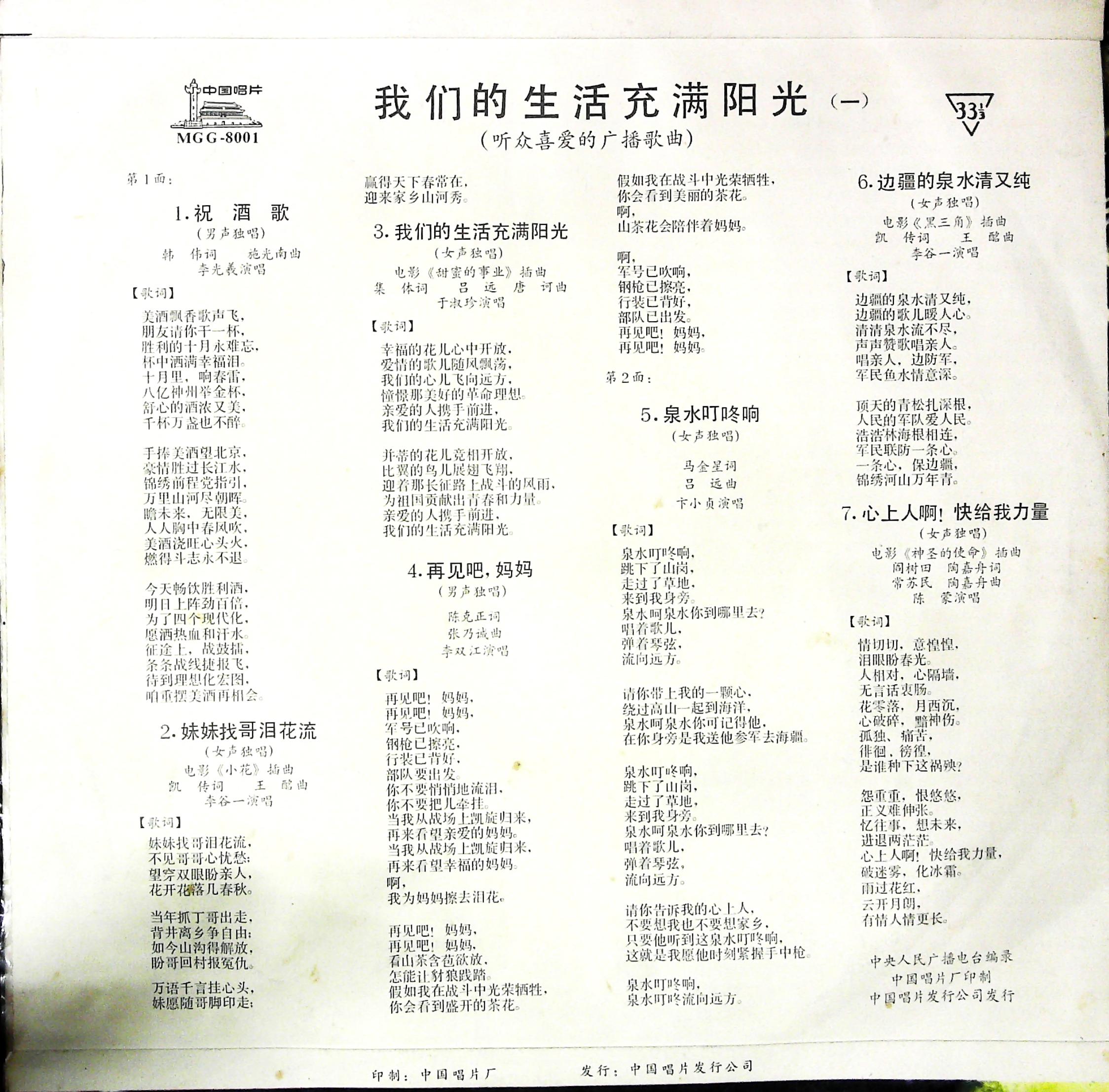 其实这些歌都很好听。但是最为人所知的,应该是于淑珍的《我们的生活充满阳光》,以及最近重新被提及的,由李谷一演唱的《绒花》。就绒花这首歌来说,我看到网易云音乐的评论里,数万条点赞说明,现在的年轻人还是可以接受当年的流行音乐的,只不过可能缺乏熟知那个历史时代的人得引导。在这张唱片中,《太阳岛上》、《我们的生活比蜜甜》、《我们的生活充满阳光》和《绒花》一样从今天的角度来看都是很好的作品。