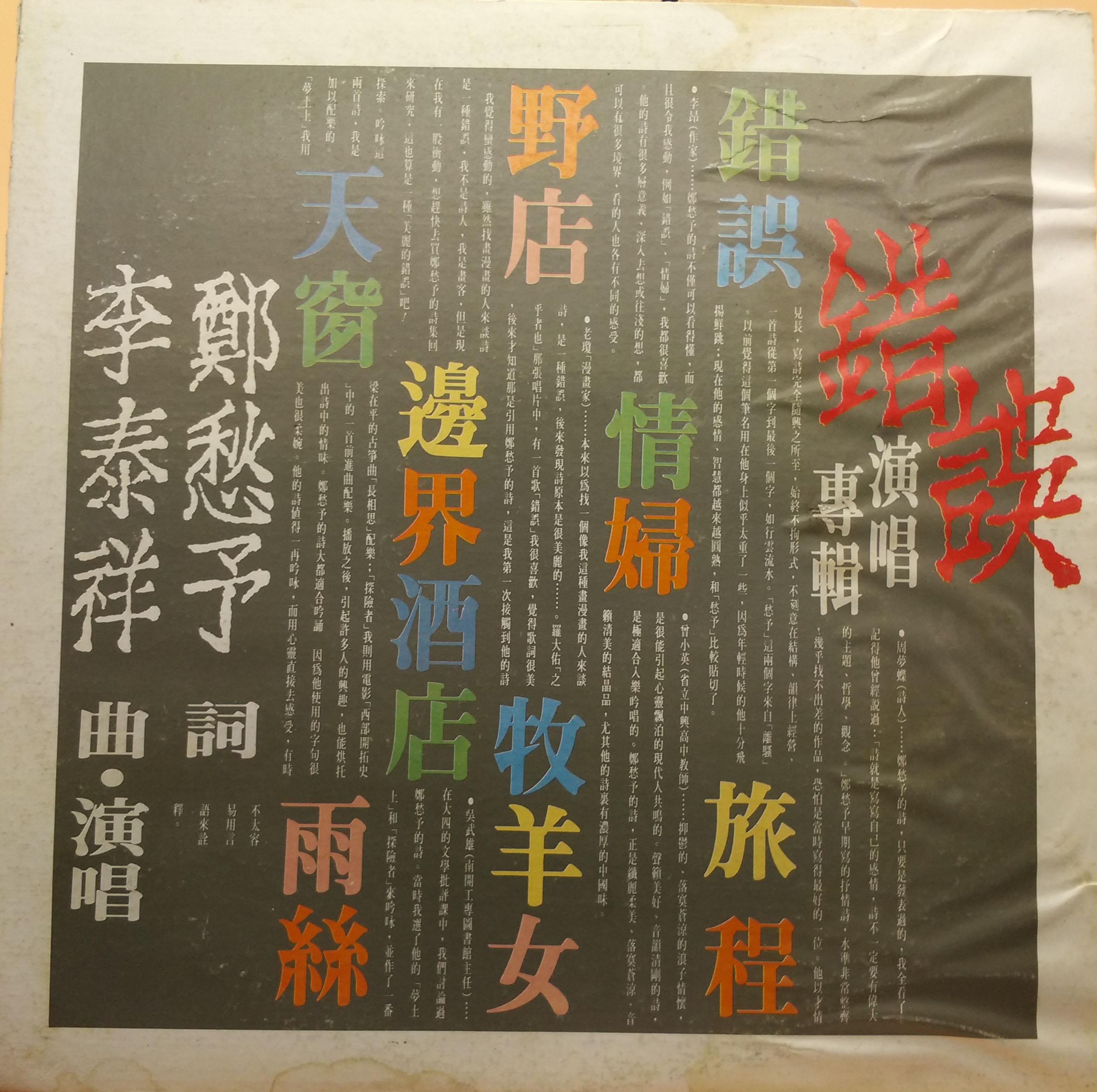 郑愁予是台湾著名诗人。李泰祥在这张专辑里面演唱的《错误》,罗大佑也唱过。但是罗大佑比起李泰祥演绎的版本,气概就差了一些。记得十几年前听这首歌的时候,一个朋友用“大漠孤烟直,长河落日圆”来形容这首歌所描写的景象,我深以为然。同样这首歌,我也推荐听 黑胶转录 的版本,和当下的Mp3版本在整体声场上差距太大了。