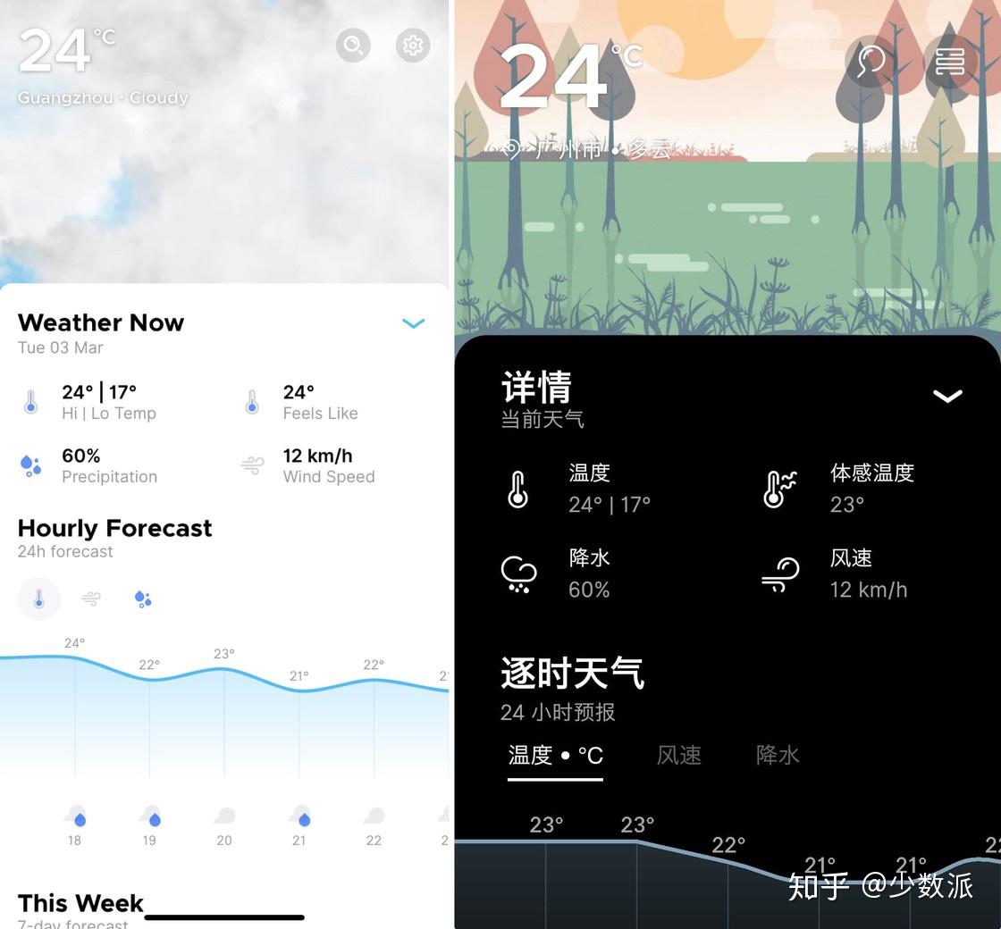 更换主题时,除了顶部的动画会有所不同外,天气详情处的图标、乃至 App 内的字体颜色都会变化。