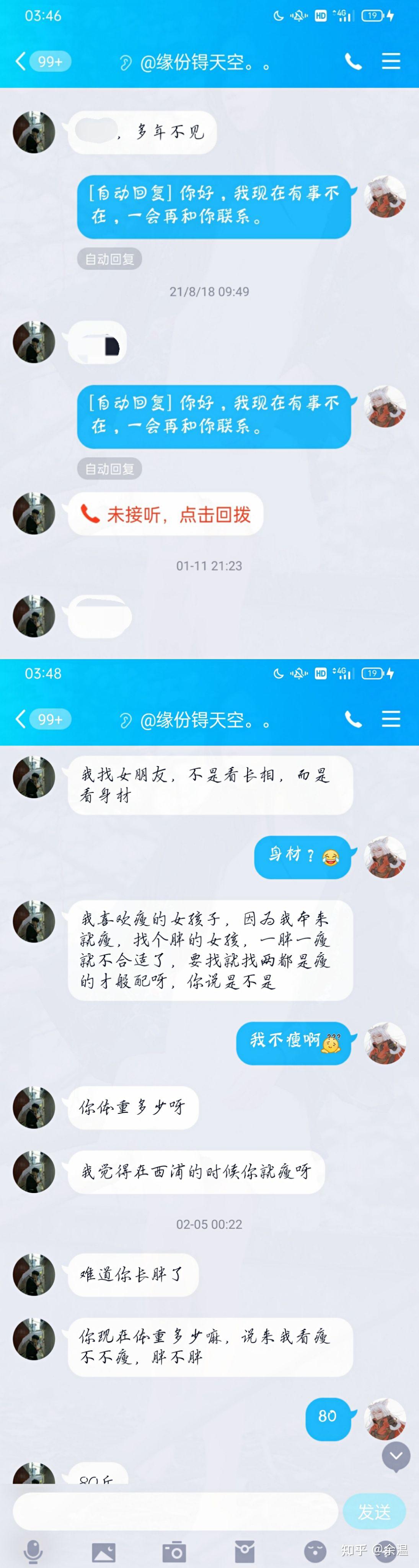 因为不怎么玩QQ,所以都是系统回复的,然后他就给我打电话,然后一直叫我名字,后面聊了一会儿就好心问了他最近的情况。谁知道他突然聊到了对象的上面,并且问了我莫名其妙的问题。