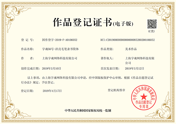 每套字体均有国家版权局出具的作品登记证书,字魂网所有用户均可在线查看作品登记证书(电子版),购买字魂网授权之后下载字体的授权证书可在线查看并下载,授权使用后不会产生任何版权风险及版权纠纷。