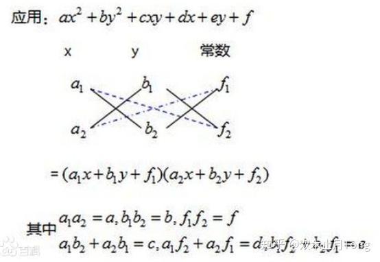 比十字相乘法再进一步的还有 双十字相乘法 ,这种方法适用的是型如: A x^{2}+B x y+C y^{2}+D x+E y+F 的多项式,方法的原理如下图
