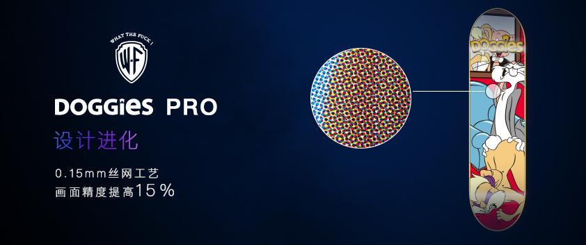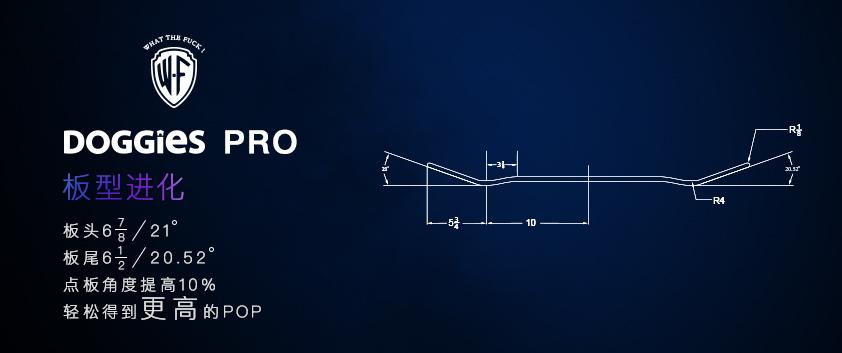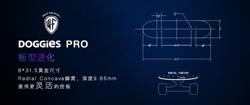 Doggies PRO采用的是国内滑手使用最多的8*31.5黄金尺寸, 头尾的尺寸分别是6 7/8和6 1/2 。脚窝的深度也采用了 标准的Radial Concave尺寸 ,脚窝深度 9.85mm ,这个尺寸美国多年来研究了几万名滑手后所设计出的街式滑板最标准的脚窝尺寸。