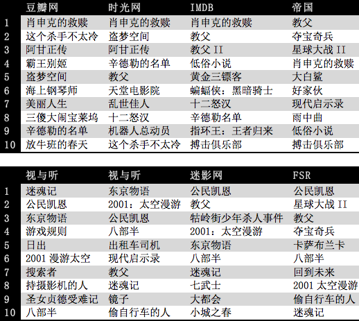 随手搜集了一些Top10榜单以供举例,其中前四份的评选者分别为网友和读者,后四份则分别为影评人、导演、华语影评人及网络影评人。可见榜单虽无好坏之分,但区别是显而易见的。豆瓣Top250中没有出现《视与听》影评人十佳(可能是当今最权威榜单)里的任何一部电影,却也不能因此认为豆瓣电影榜单是“名不副实”的。