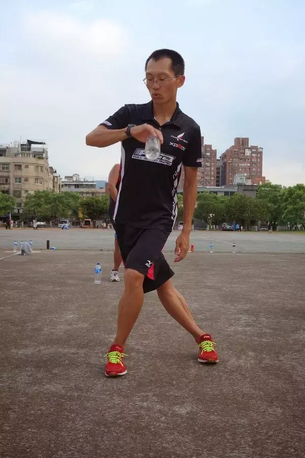 或者是:手不拿水瓶慢慢向下蹲、头保持向前看。