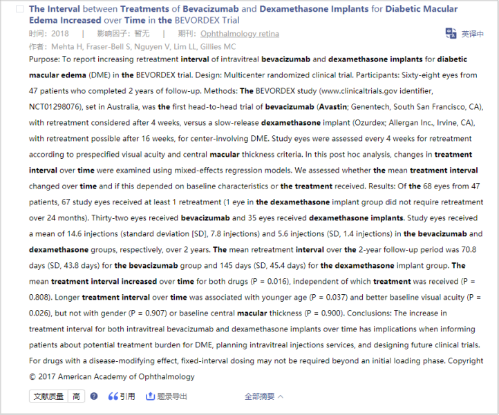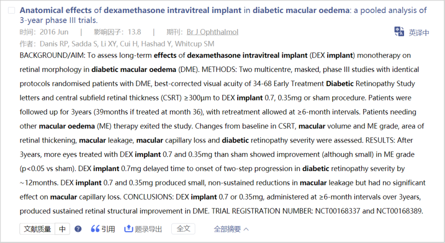 随着疾病研究的深入和药物缓释技术的发展, 以Ozurdex(Allergan公司)为代表的新型地塞米松玻璃体腔内植入剂(DEX)投入临床应用系解决过往激素类药物眼内降解和半衰期短的问题。 作为最佳的医学学术合伙人,为探究地塞米松玻璃体腔内植入剂对DME患者的有效性和安全性,小灵立刻在EviMed平台( http://www. evimed.com )中循证寻找答案。