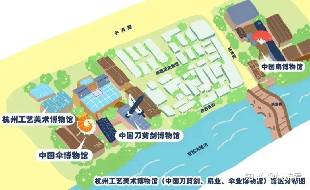 它们都在运河边的桥西历史文化街区,中国伞博物馆、中国刀剪剑博物馆和杭州工艺美术博物馆挨在一起,中国扇博物馆则在另一边,桥弄街的北侧。