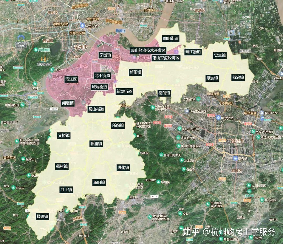 2、萧山区:蜀山、新街、义桥、临浦、衙前、南阳、新塘、戴村、河上、浦阳、所前、进化、瓜沥、靖江、楼塔、益农、党湾等街镇;