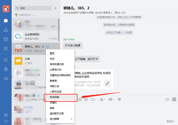 等管理员设置好后,再由外部群的 群主 将鼠标放在外部群聊会话框上,点击右键,进入自动回复页面,开启自动回复功能,才可使用。群主不能单独设置关键词以及回复语。