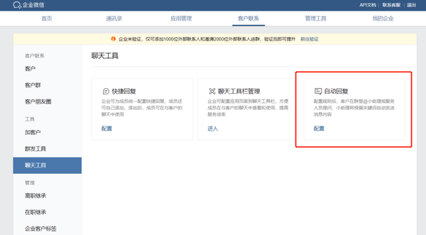 企业微信的营销机器人功能 只要注册即可免费使用 ,不过它需要由 管理员 进入 企业微信管理后台 ,在【客户联系】-【聊天工具】-【自动回复】中添加关键词,以及关键词对应的回复语。