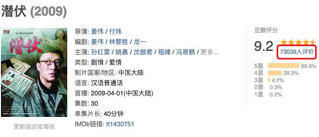 来看一下姜伟导演作品的豆瓣评分。7万多人评分的《潜伏》,豆瓣9.2,高得吓人。而这样的整体成绩,估计国产剧导演,并且是有原创剧本能力的导演,找不到几个。