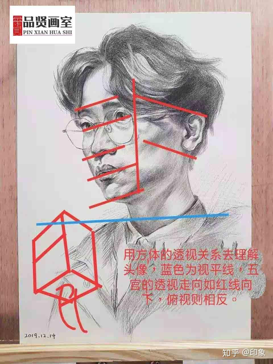 例如下图是画室一个学生画的头像,用方体的两点透视关系去理解同像的五官透视走向