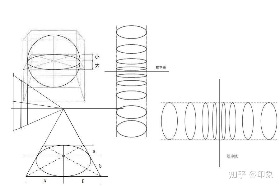 规律:离视平线或中视线越近椭圆的弧度就越小,反之越大。(看下图 )
