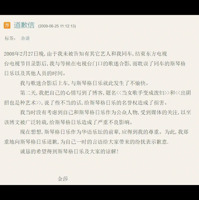 金莎在08年3月份发博文骂斯琴格日乐是“泼妇”,原因是二人在参加完舞林大会乘车离开时,金莎和歌迷合影耽误了时间,斯琴格日乐当场对金莎的歌迷大骂滚蛋,金莎为了维护歌迷下车。