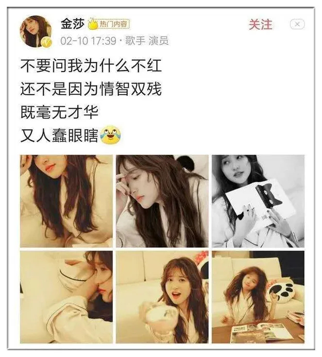 关于为什么不红了,金莎也自嘲过,“还不是因为情智双残,既毫无才华,又人蠢眼瞎”。