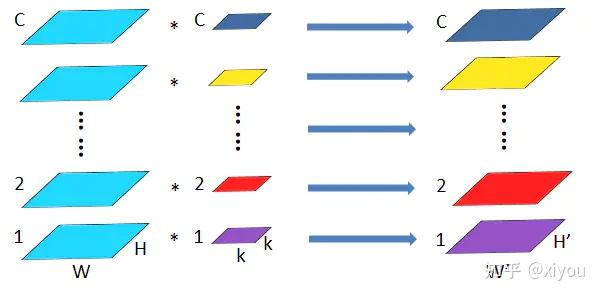 如上图所示,深度分离卷积是分组卷积的一种特殊形式,其分组数为C,其中是feature map的通道数。即把每个feature map分为一组,分别在组内做卷积,每组内的单个卷积核尺寸为,组内一个卷积核生成一个feature map。这种卷积形式是最高效的卷积形式,相比普通卷积,用同等的参数量和运算量就能够生成个feature map,而普通卷积只能生成一个feature map。