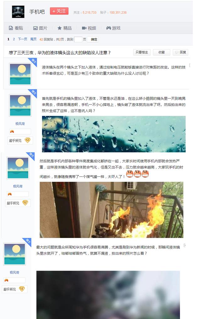 在某吧上,有人一本正经地想了三天三夜,列举了华为液体镜头的三大缺陷。看完之后,真让人笑哭啊!下面这兄弟怕是把华为手机当热水器用吧!