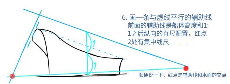 6.点线和平行辅助线前面的辅助线是船体的高度和1:1之后纵向的直线配置红点2处是集中线规