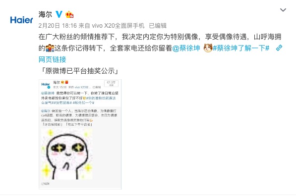 对公共事件、娱乐八卦如此热心的海尔官微,对自己的粉丝更热心。不仅时不时解答情感疑惑,还当红娘帮粉丝表白、征婚,最近还开始和粉丝一起追剧追星,不仅蹭了一下《偶像练习生》蔡徐坤的热度,连比较冷门的《霹雳布袋戏》也知道。