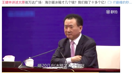2016 年 10 月,王健林的一条视频在微博传播,内容是万达砸钱回购商铺,相比之下,王健林认为同年代「海尔老总张瑞敏砸冰箱」算不上什么。吃瓜群众 at 官微后,海尔官微机智「回怼」: