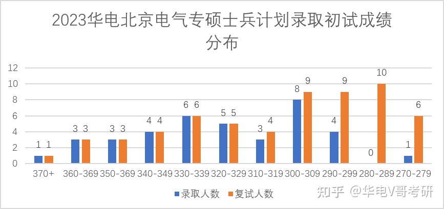 北京士兵计划最终招收40人,其中学硕2名,专硕38名,学硕名额过少不作分析,士兵计划专硕录取最低分为277分,初试一比一的分数线为296分,初试的平均分为325.3分,复试的逆袭概率极低。今年北京士兵计划的分数相较往年明显提升,往年士兵计划基本都是国家线等额复试,今年北京士兵计划专硕招生38人,但过国家线却有60人!但同时值得注意的是北京士兵计划的录取分数还是要远低于普通考生,对于满足士兵计划的同学,华电依然是不错的选择。初试的成绩分布如下: